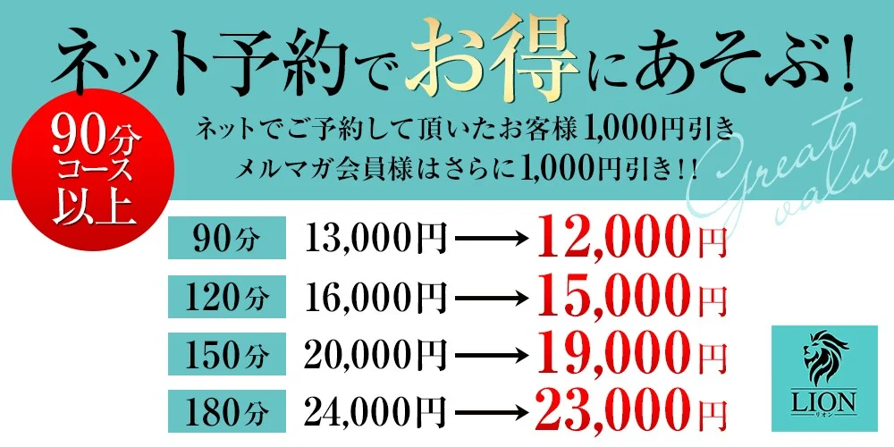- 60分 10000円→70分 10000円 当店を初めてご利用のお客様限定 LIONの体験版コースとなります。 いつもご愛顧いただいているお客様につきましては ご了承ください。